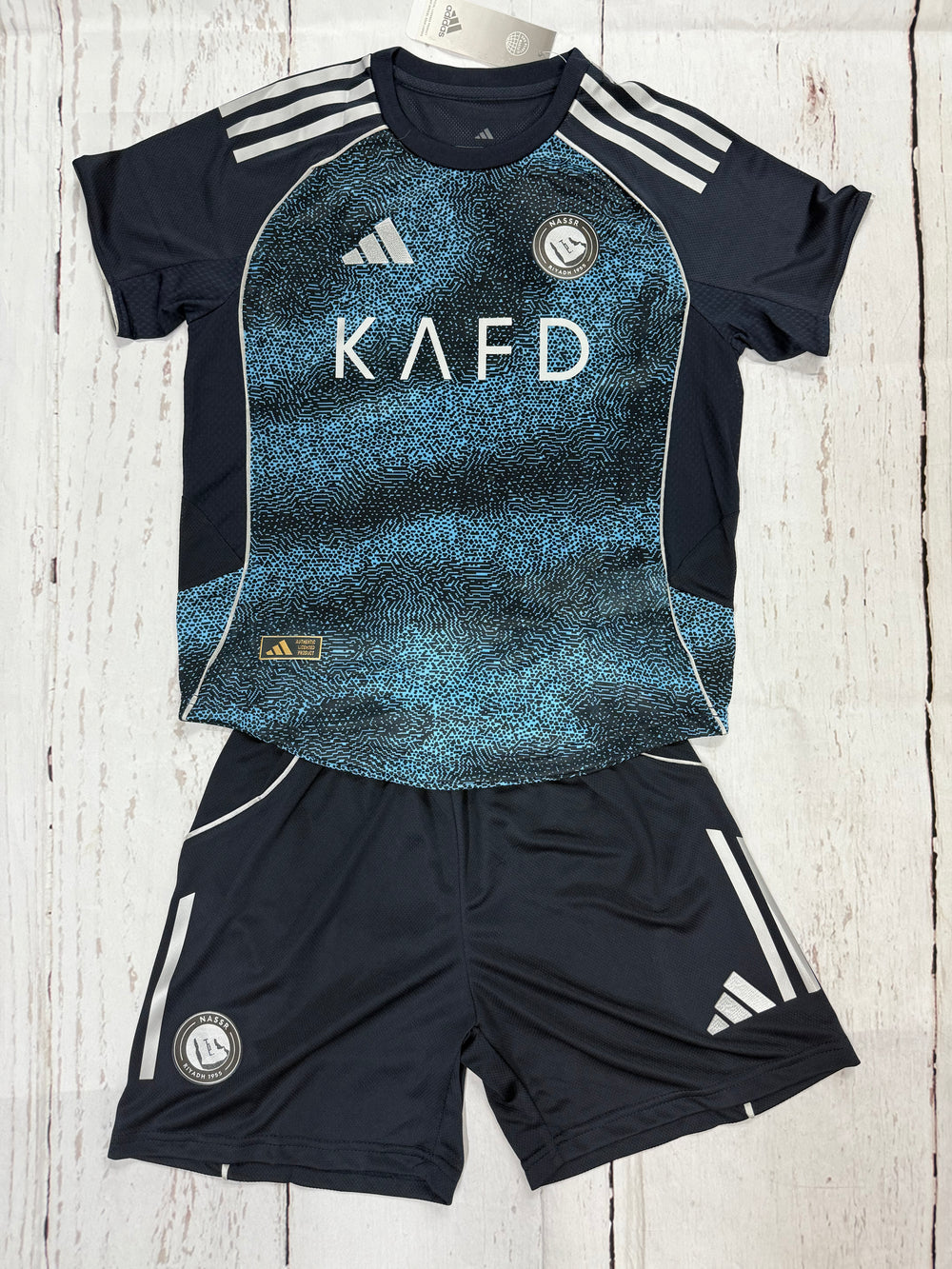 Let young fans show their support for Cristiano Ronaldo and Al Nassr with this stylish 2025-26 Youth Navy Soccer Kit. This set includes a high-quality jersey and matching shorts inspired by the club’s official away design, giving kids a professional on-pitch look.