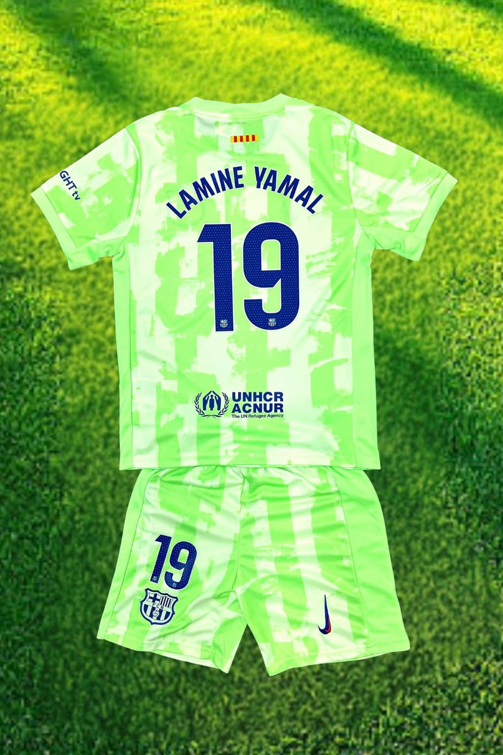 Support rising star Lamine Yamal with this Youth Lamine Yamal Jersey Lime Green Barca Kit (Jersey + Shorts) Kids Set. Designed for young soccer fans, this set includes a matching jersey and shorts that give kids a bold and professional match-day look inspired by Barcelona style.